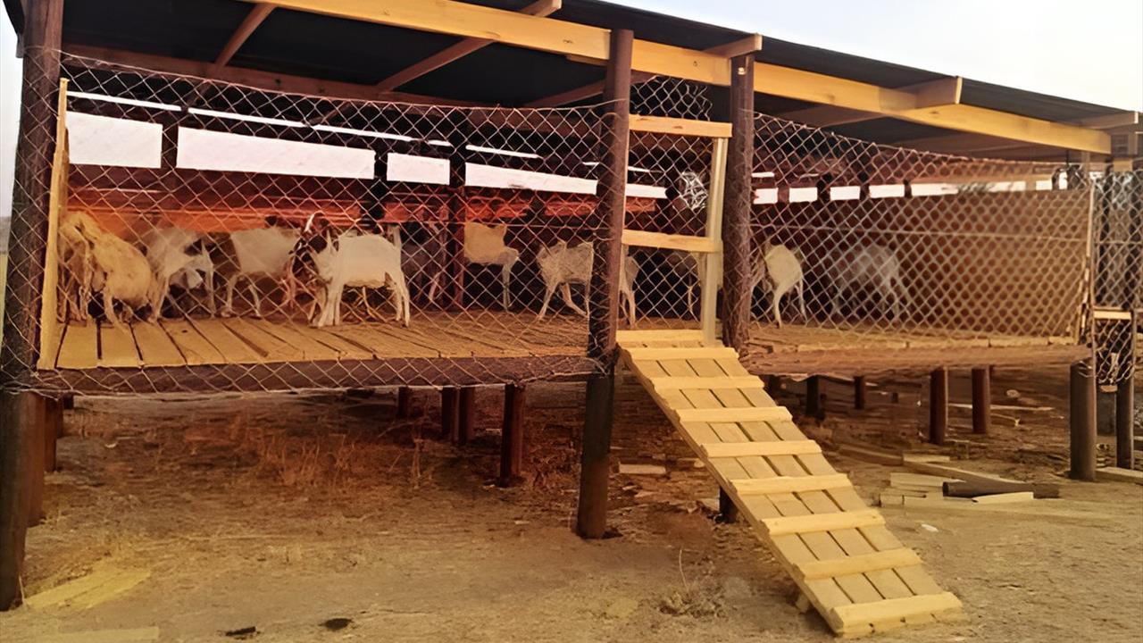 A raised goat house like the one shown is designed to protect the animals, improve sanitation, and increase overall productivity in rural African settings. By elevating the structure off the ground, goats are kept dry during heavy rains and away from mud, parasites, and disease that commonly spread through damp soil and waste buildup. The slatted flooring allows manure to fall through, keeping the living area clean while making it easier to collect droppings for fertilizer. The raised design also improves ventilation, reduces hoof problems, and protects the herd from predators, ultimately resulting in healthier goats, stronger breeding outcomes, and greater milk and meat production.