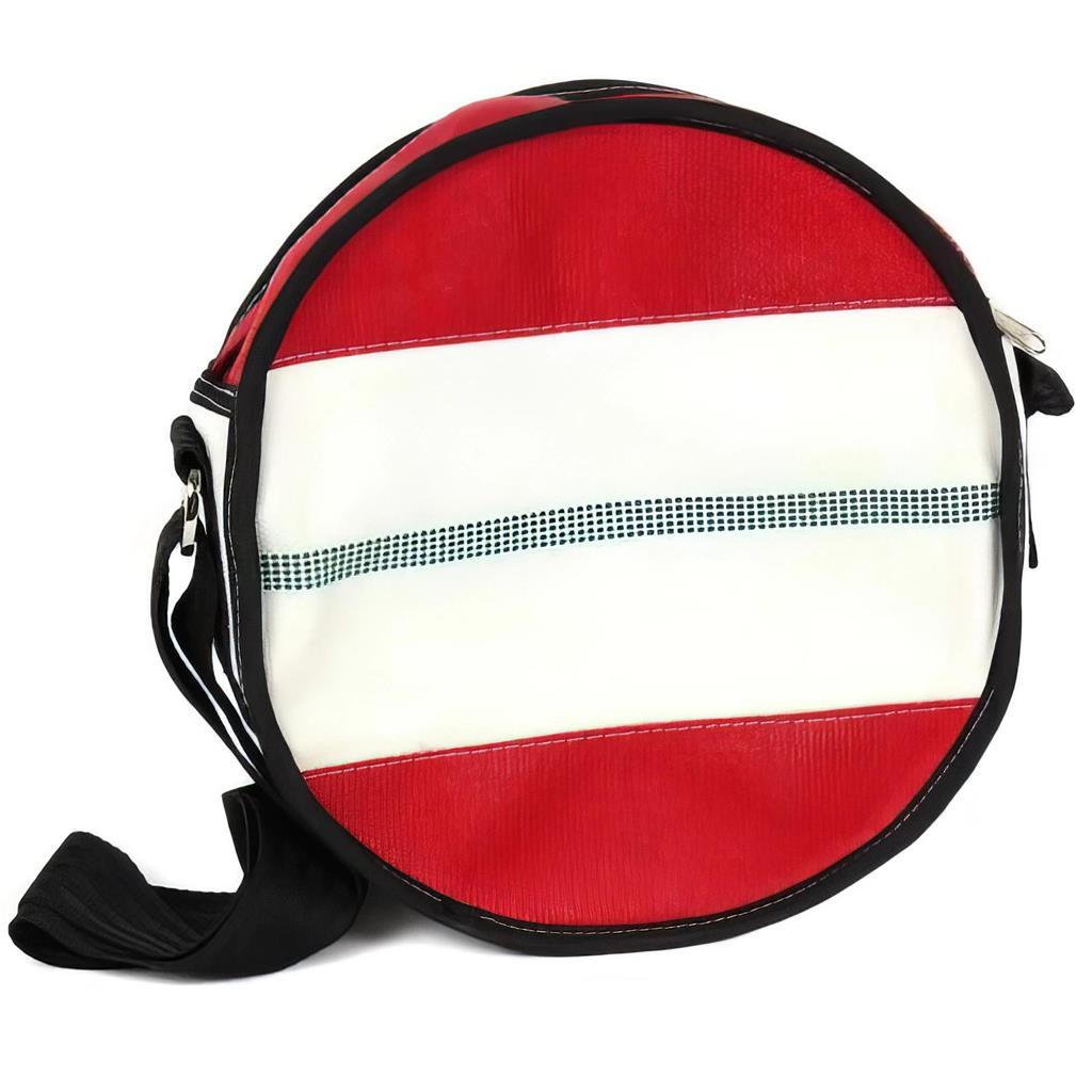 See full descriptionThis round binocular bag is sure to grab attention! Crafted from reused fire hose and silky lining to make sure you have a stylish accessory for all your essentials. Features a large zippered pocket and smaller open pocket for easy accessibility.