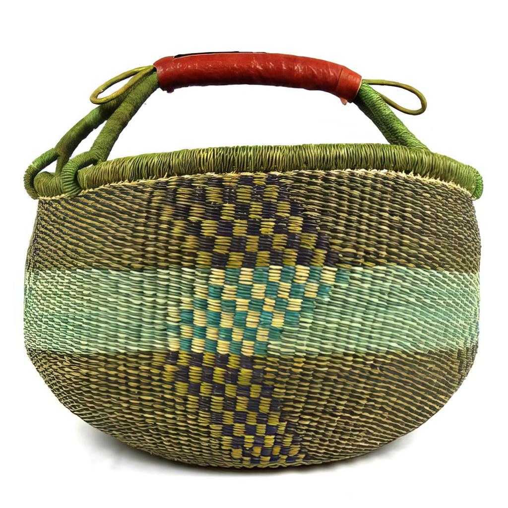 See full descriptionThe beautiful bolga baskets are hand-woven in small villages of Ghana, a tradition passed down from generation to generation. They are woven out of renewable resources, including banana leaf and elephant grass, which grow abundantly in the region. The leather is treated using an all-natural process (either dyed and oiled or painted). Each basket is hand woven and 100% unique! Variations are to be expected and treasured. Baskets are sturdy, strong, and flexible. If properly cared for, your basket will live a long life.